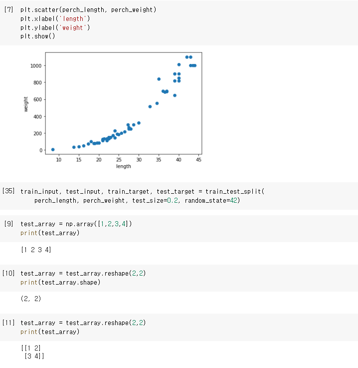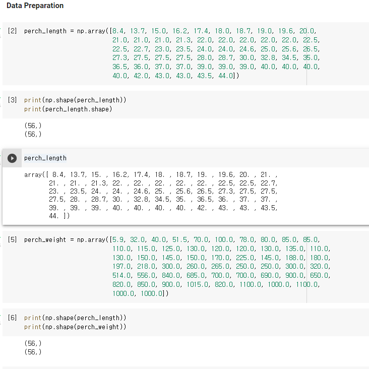 - 농어의 길이와 무게 데이터를 입력한 후, 데이터 수 및 shape을 검토 합니다.
