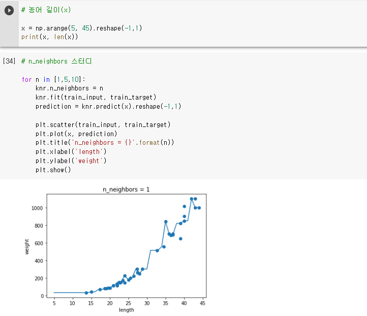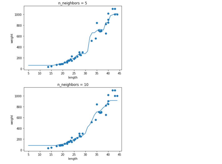 - 미션: n_neighbors를 변경(1, 5, 10)해 가며, 농어 길이에 따른 예측 결과 검토하기
