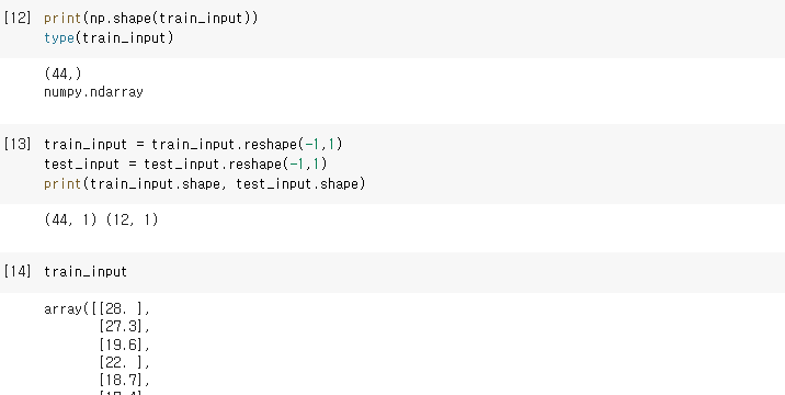 - 학습을 위해서는 2차원 배열로 만들기 위해 reshape(-1, 1)을 해야 합니다(아래 추가 설명).