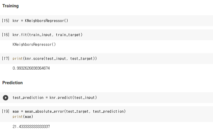 - KNeighborsRegressor() 선형 회귀 모델을 'knr'이란 변수로 선언한 후, fit을 통해 모델을 학습 시킵니다.