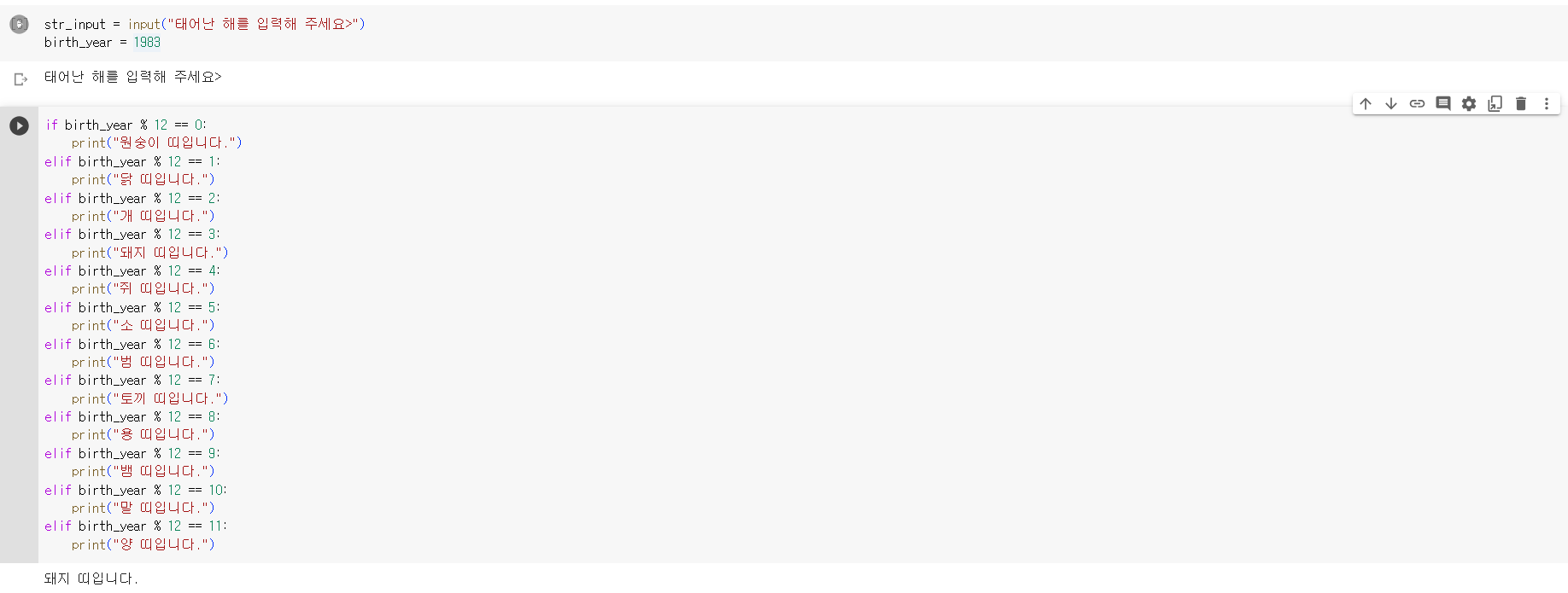 작성시 입력받은 연도를 12로 나눈 나머지를 사용함.