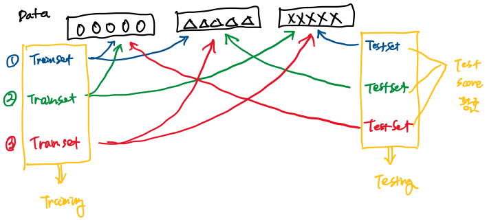 - 아래 그림은 3-Fold Cross Validation 을 설명한 그림으로, K-Fold Cross Validation(K=3)에서 train set을 3 부분으로 나누어 수행한 경우입니다.