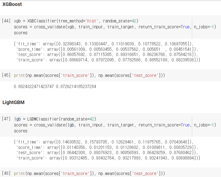 - 이 모델 역시 cross_validate를 통해 교차검증을 할 수 있고, feature_importances_ 또한 확인할 수 있습니다.