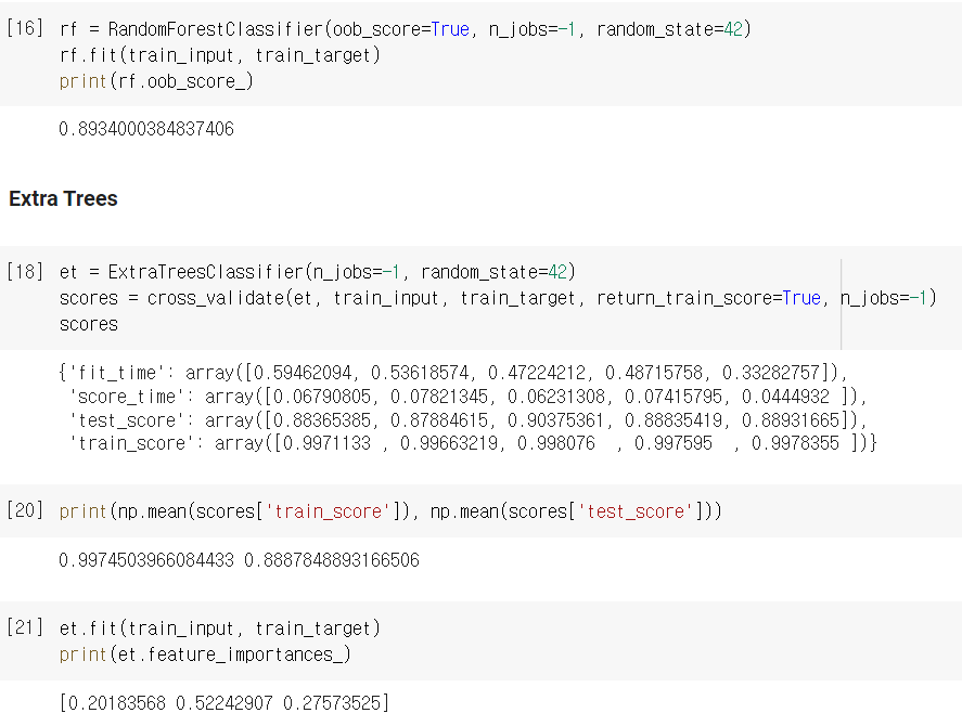 - Extra Trees 모델도 역시 cross_validate로 검증할 수 있고 적용할 수 있는 매개변수는 Random Forest와 동일합니다.