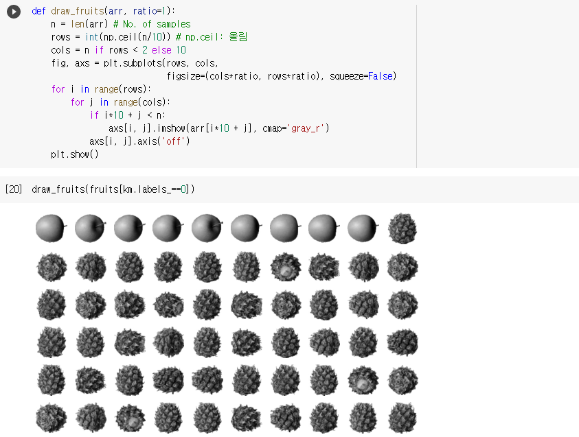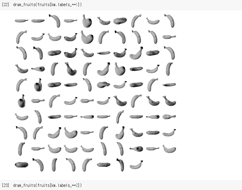 KMeans model & fit - 각 cluster 가 어떤 이미지를 나타냈는지 그림으로 출력하기 위해 "draw_fruits()"라는 함수를 정의 후 사용합니다. "draw_fruits()"라는 함수는 subplot을 이용해 이미지를 plot 해주도록 만든 함수입니다. Clustering된 결과가 "km.labels_"에 저장되어 있으므로, label을 지정할 때마다 (draw_fruits(fruits[km.labels_==0]) 형태로 label에 해당되는 샘플의 이미지를 확인할 수 있습니다.