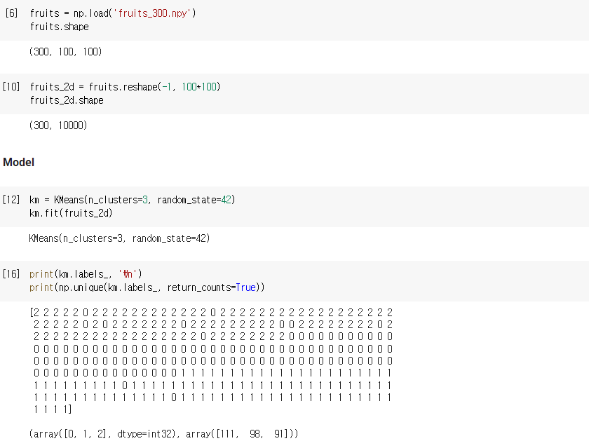 - 이것은 KMeans 모델 학습을 위해 2차원 배열(샘플 개수, 너비 * 높이)로 reshape시킵니다.