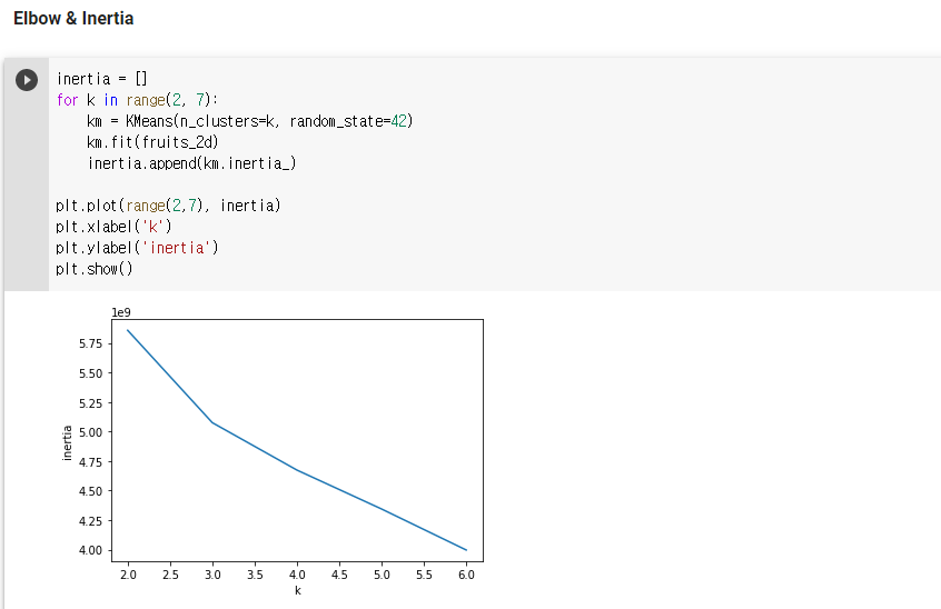 - 최적의 k 찾기 위한 방법은 앞서 언급된 transform() 메서드를 통해 계산되는 거리를 통해 이루어지는데, 이 거리 제곱의 합을 Inertia(이너셔)라고 합니다. 일반적으로 cluster개수가 늘어나면 클러스터 개개의 크기가 줄어들기 때문에 inertia도 줄어듭니다.