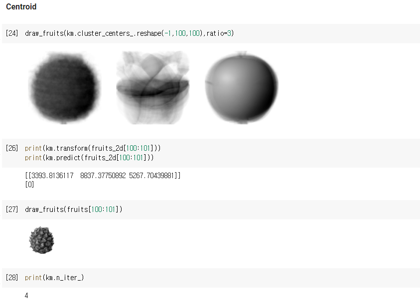 - Centroid 또는 Center of Cluster(클러스터 중심)은 K-Means 알고리즘이 만든 클러스터에 속한 샘플의 특성 평균값. 가장 가까운 클러스터 중심을 샘플의 또 다른 특성으로 사용하거나 새로운 샘플에 대한 예측으로 활용할 수 있음.