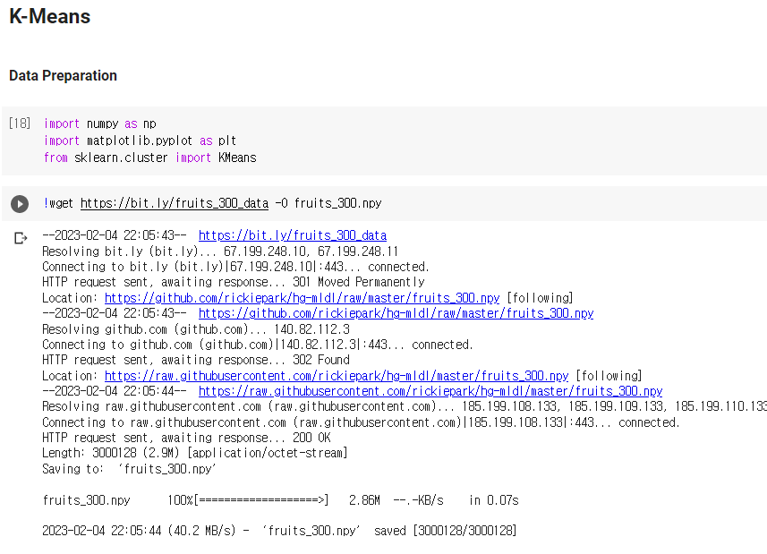 - KMeans 모델을 학습 시키기 위한 데이터를 wget을 통해 불러오고, 넘파이 배열(npy)로 저장합니다.
