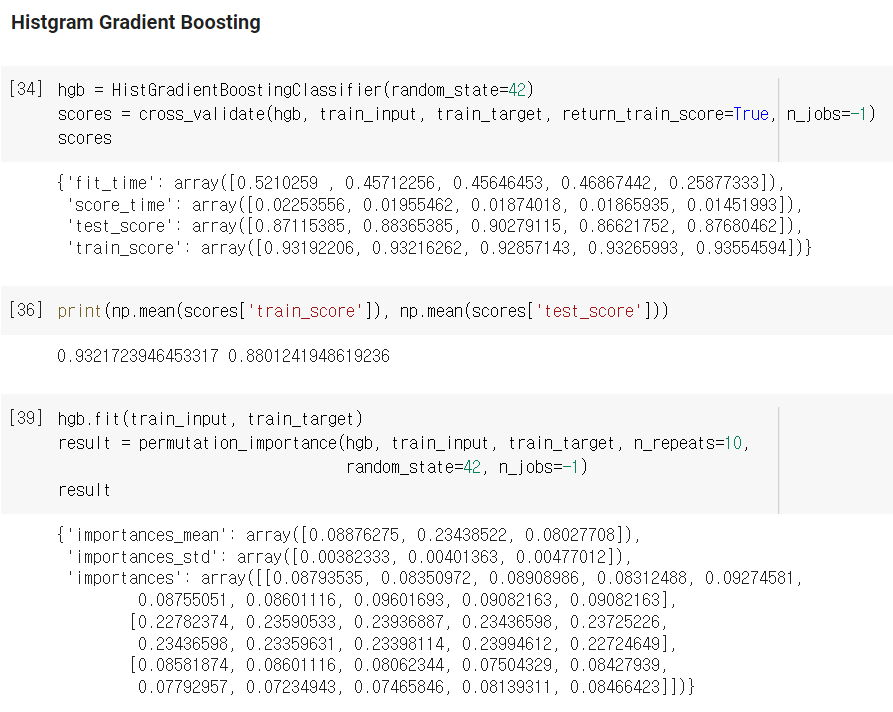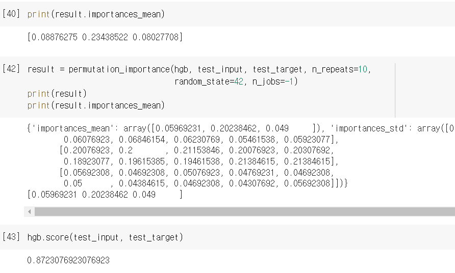 - 한편, HistGradientBoostingClassifier는 input data 특성의 중요성을 판단할 때, permutation_imporance라는 기능을 활용합니다.