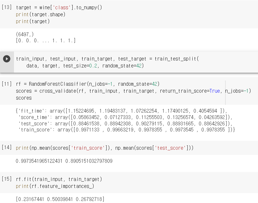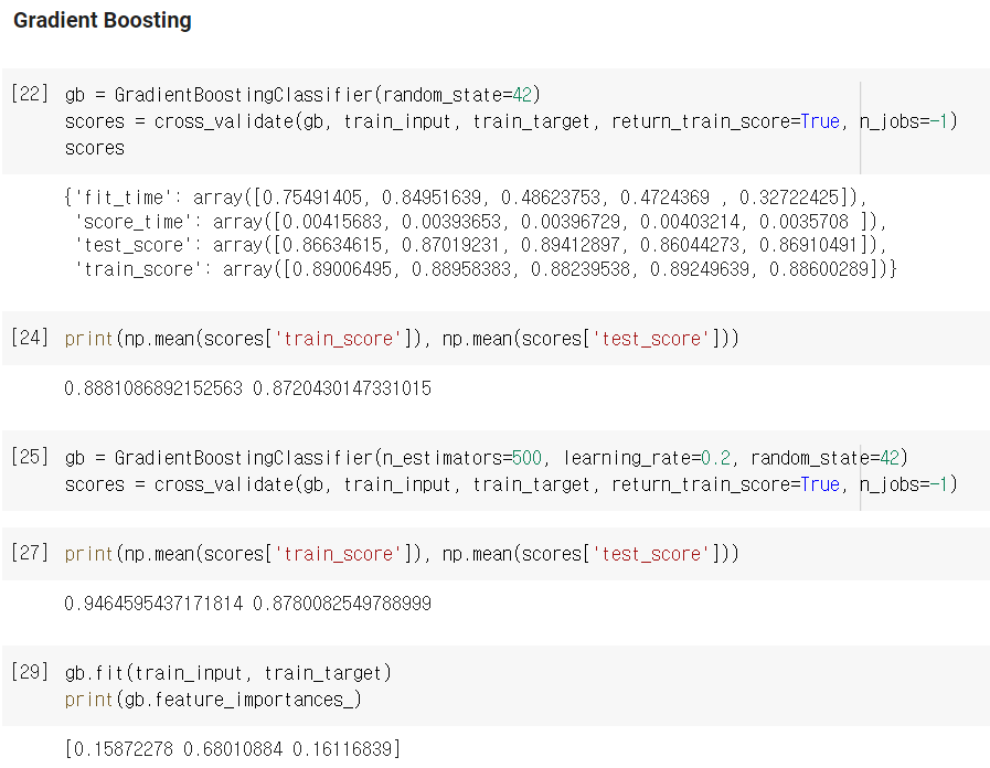 - 이 모델 역시 cross_validate를 통해 교차검증을 할 수 있고, feature_importances_ 또한 확인할 수 있습니다.