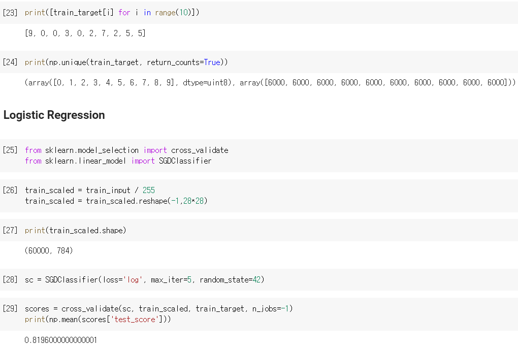 cross_validate 라이브러리를 이용하여 데이터를 효율적으로 학습시키고, SGD분류기로 모델을 학습합니다.