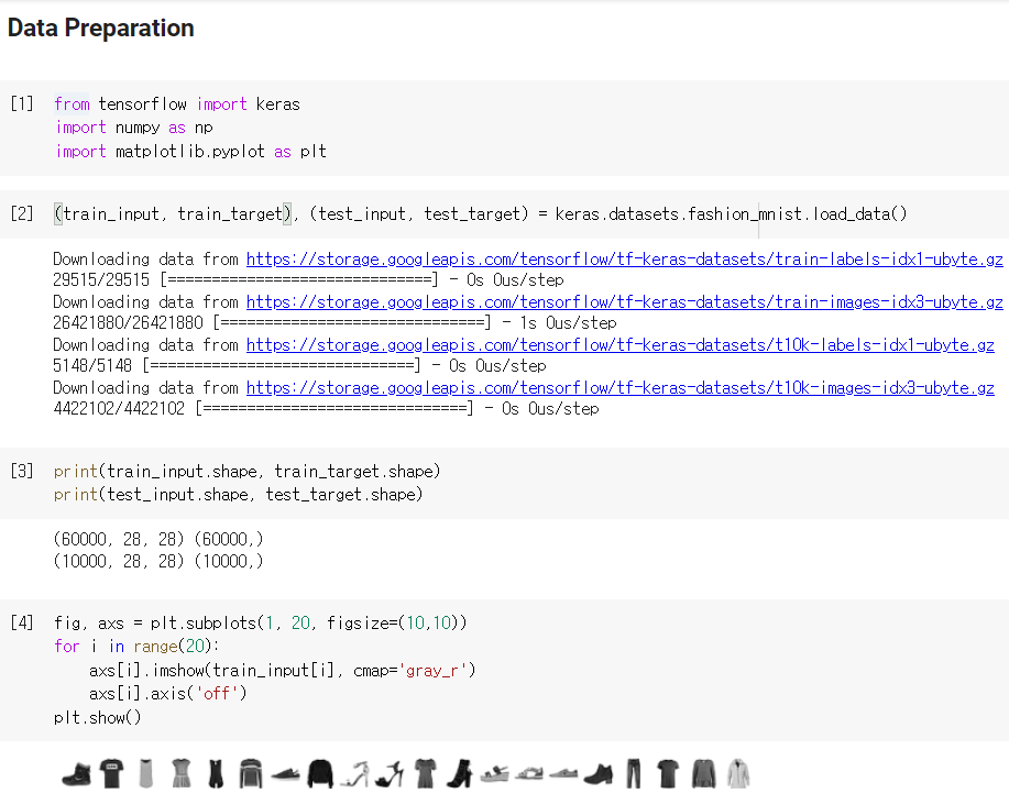 mnist fashion data를 load한 후, train_input, train_target, test_input, test_target이란 변수에 넣습니다.